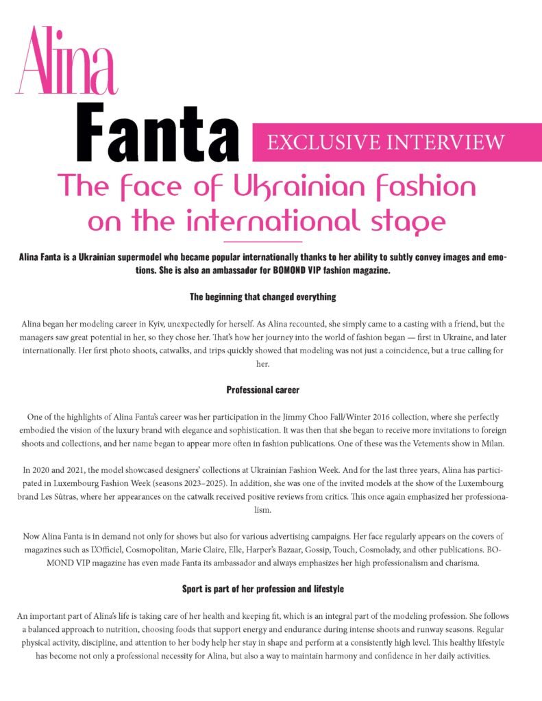 managers saw great potential in her, so they chose her. That’s how her journey into the world of fashion began — first in Ukraine, and later