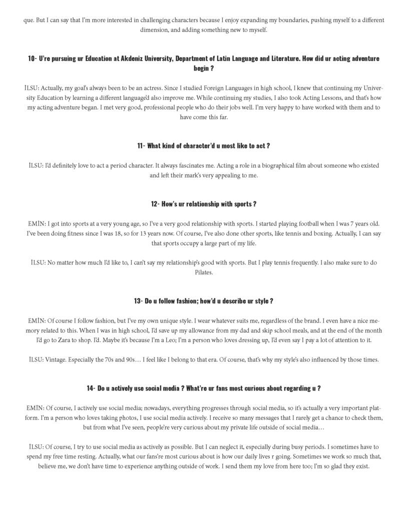 İLSU: Of course, I try to use social media as actively as possible. But I can neglect it, especially during busy periods. I sometimes have to spend my free time resting. Actually, what our fans’re most curious about is how our daily lives r going. Sometimes we work so much that, believe me, we don’t have time to experience anything outside of work. I send them my love from here too; I’m so glad they exist.
