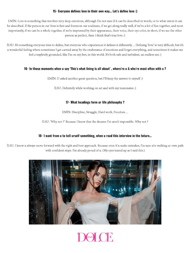 İLSU: It’s something everyone tries to define, but everyone who experiences it defines it differently… Defining ‘love’ is very difficult, but it’s a wonderful feeling where sometimes I get carried away by the exuberance of emotions and forget everything, and sometimes it makes me feel completely grounded, like I’m on my feet, in this world. It’s both safe and turbulent, an endless sea 🙂